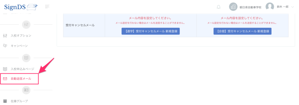 画面左のメニューから「自動返信メール設定」をクリックします。