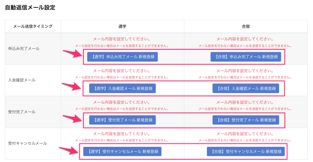 画面右の[〜新規登録]をクリックすると、送信タイミングと通学/合宿ごとにメール文章の設定が行なえます。