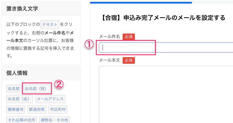 ①「メール件名」の入力欄をクリックして、「個人情報」-『お名前(姓)』をクリックします。