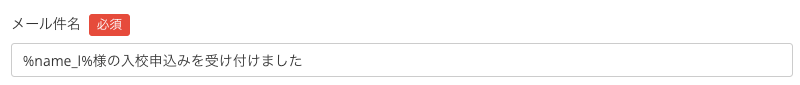 例えば、メール件名を「◯◯様の入校申込みを受け付けました」として、◯◯の部分には本人が申し込みページで入力した名字を表示させたいとします。