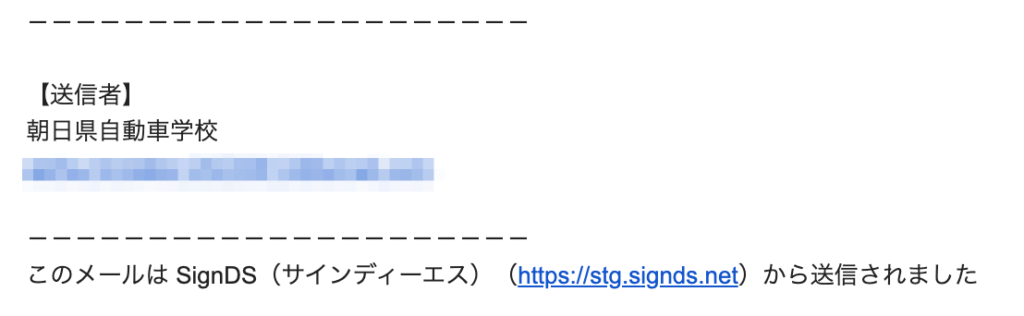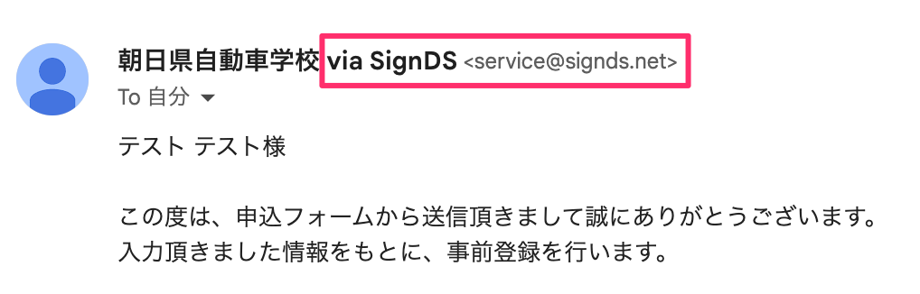 この場合、メール送信者名には「ご契約者名 + via SignDS」と表示され、送信元メールアドレスは「service@signds.net」と表示されます。
