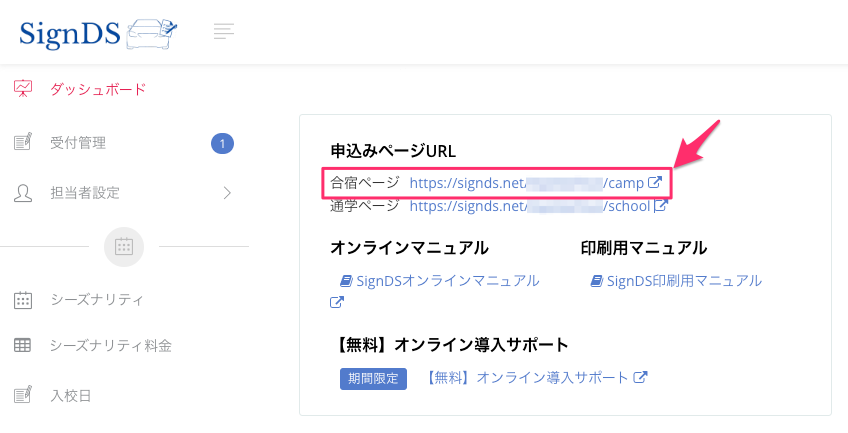 「ダッシュボード」の「申し込みページURL」の『合宿ページ』を開き、実際に申し込みを試してみてください。