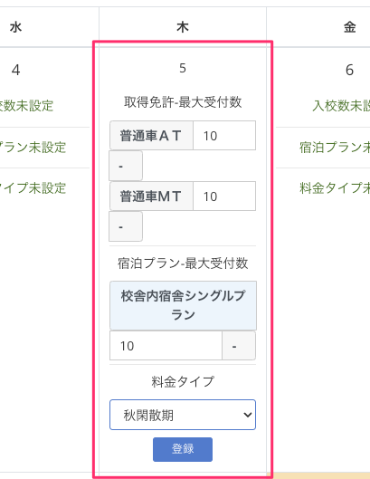 3.取得免許の最大受付数と、宿泊プランの最大受付数と、料金タイプをそれぞれ設定します。