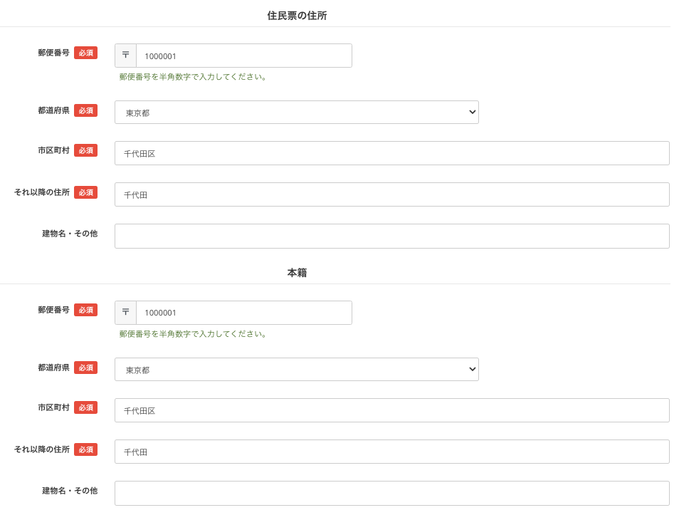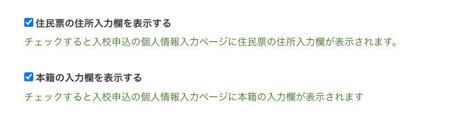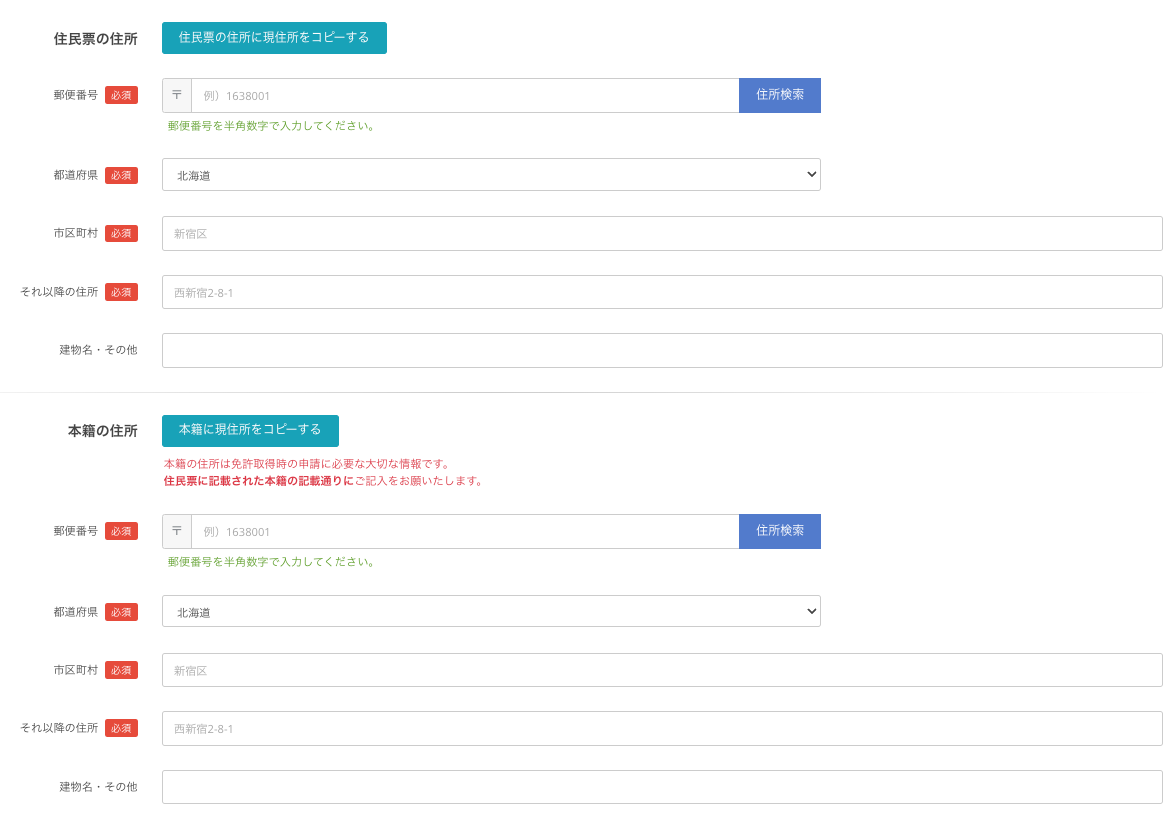 上図の通り「共通設定」で各項目を表示する設定にしている場合、住民票画像の添付を条件に、お申し込み画面と受付処理画面で「住民票の住所」と「本籍」が入力できるようになります。