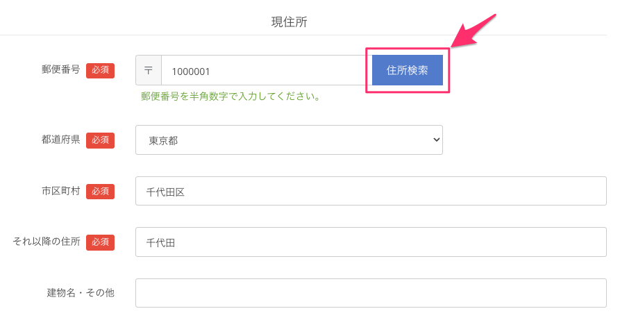 申し込み時郵便番号から住所検索をボタンで行えるようにしました