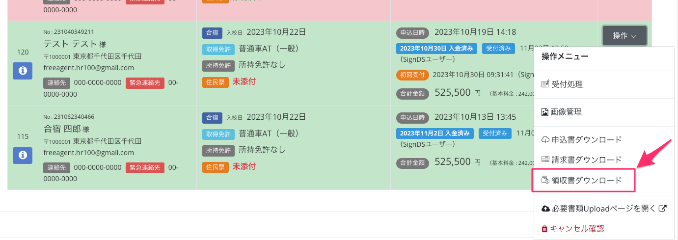 受付管理の「操作メニュー」から『領収書ダウンロード』が選べるようになりました。