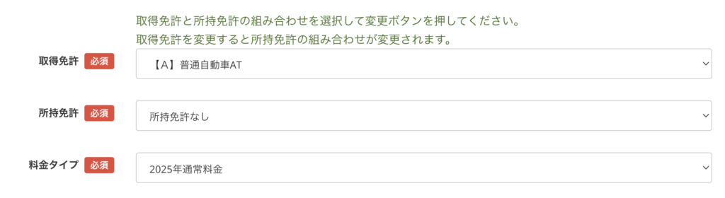 4.下図の入力項目が表示されますので、手順2で控えた内容を選択します。
