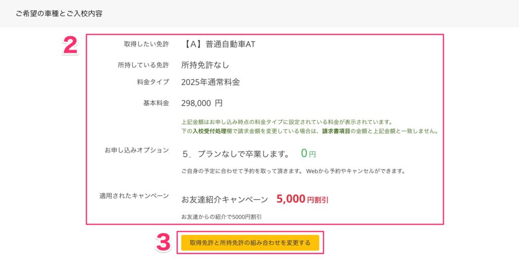 5.組み合わせによって「入校オプション」が表示されるので、元の申し込みで指定している場合は同じ内容を選択します。