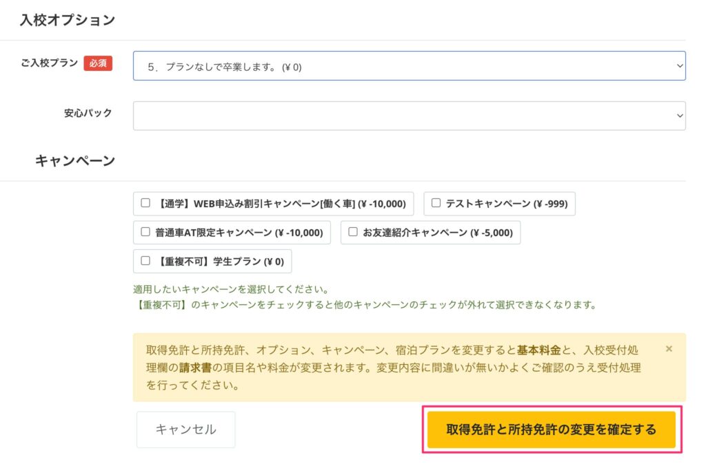 6.「キャンペーン」で対象外とするキャンペーンにチェックが”入っていない”ことを確認して、[取得免許と所持免許の変更を確定する]をクリックします。