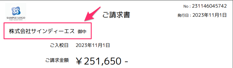 自動的に請求書の宛先が『 請求書・領収書の宛名 + 御中 』で表示されます。