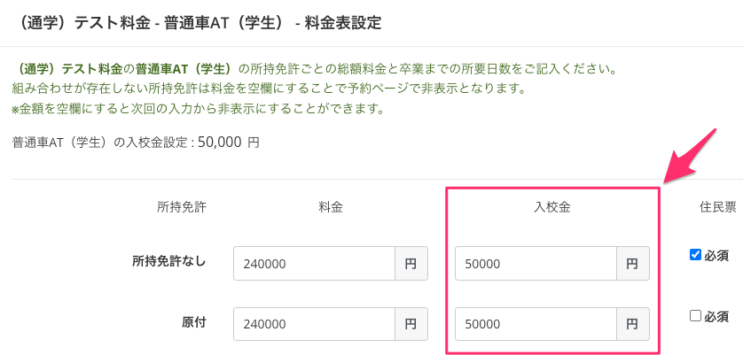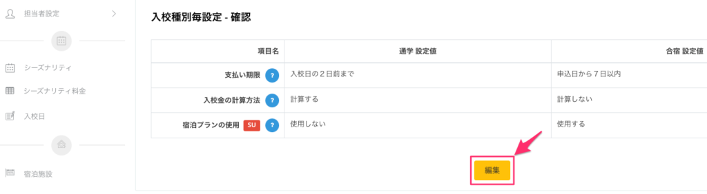 設定画面 – 入校種別毎設定