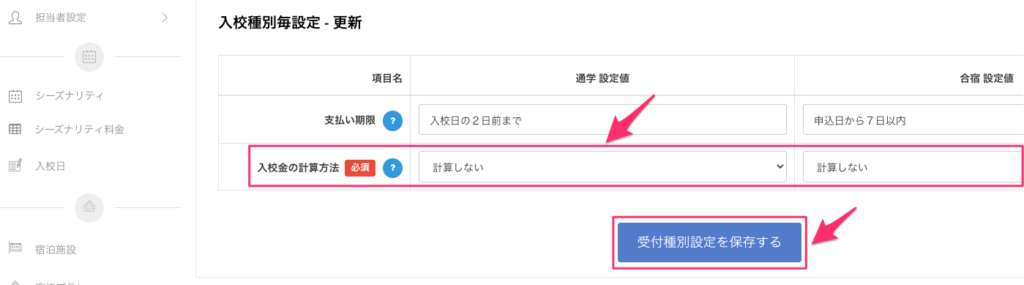 3.「入校金の計算方法」を『計算しない』に変更し、[受付種別設定を保存する]をクリックします。