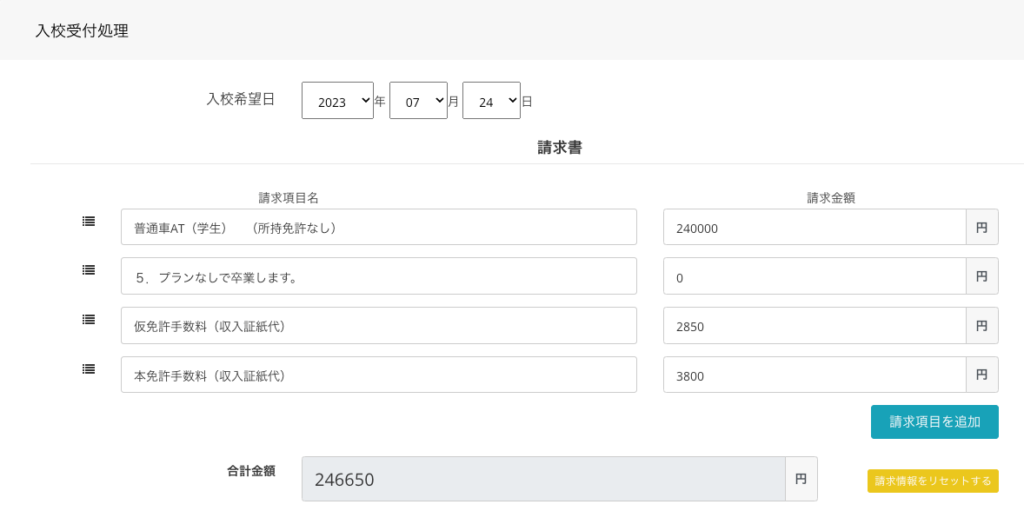 現在の設定に基づいて請求情報が再設定され、自動的に「入校金」が削除されます。