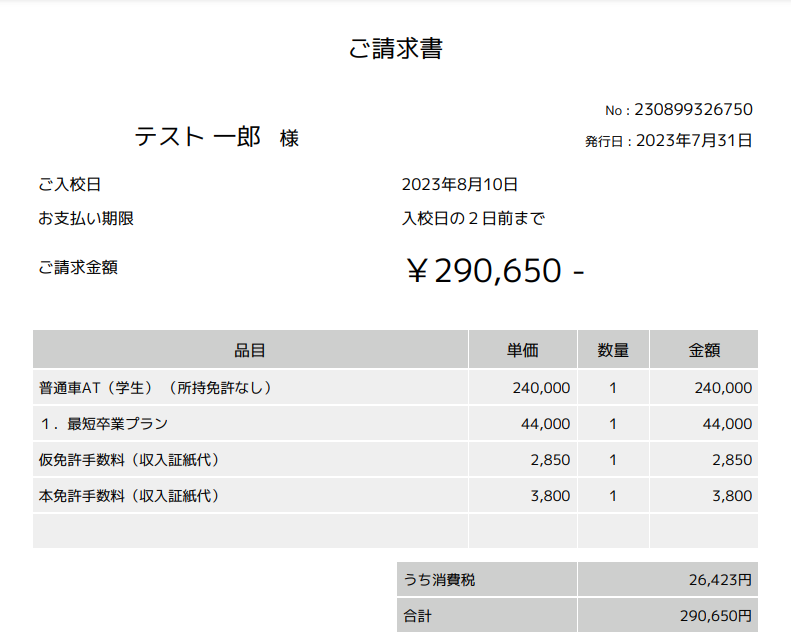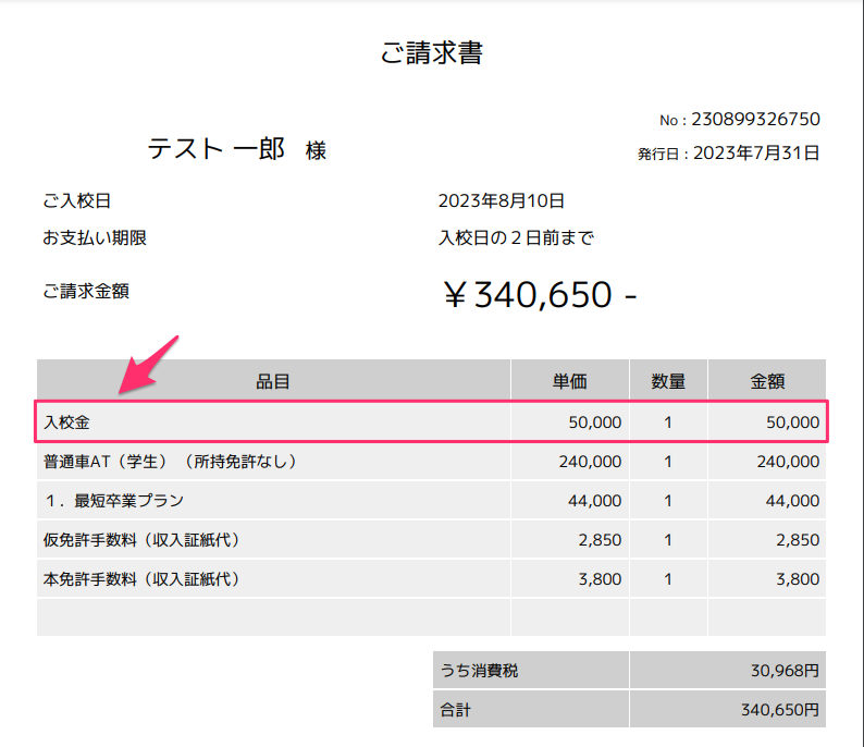上記設定後に申し込みがされた場合は、請求書に「入校金」の明細は表示されなくなります。