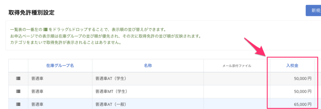 入校金を計算しない設定にしても、「取得免許種別設定」や「シーズナリティ料金」画面にある「入校金」項目は削除されたり、非表示にはなりません。