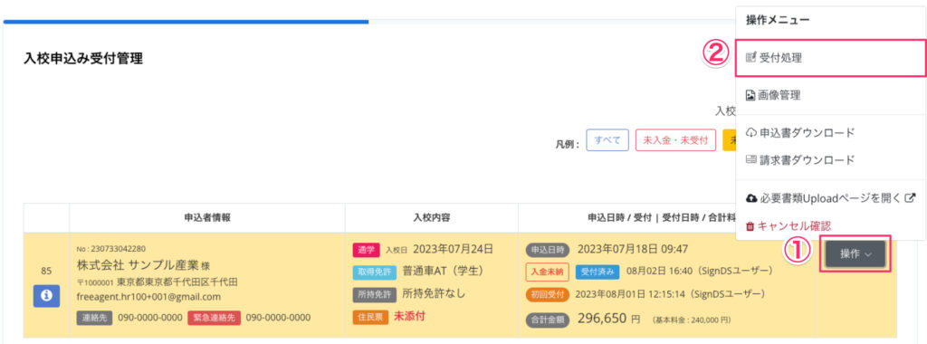2.内容を修正したい申し込みの[操作]-「受付処理」をクリックします。