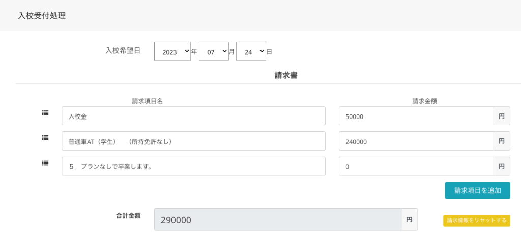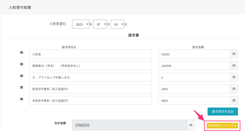 3.「入校受付処理」内の[請求情報をリセットする]をクリックします。