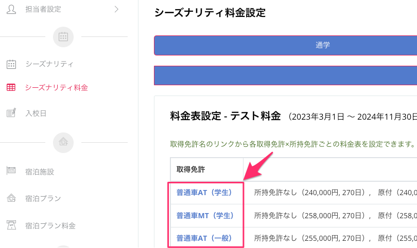 1.管理画面左のメニューから「シーズナリティ料金」を開きます。