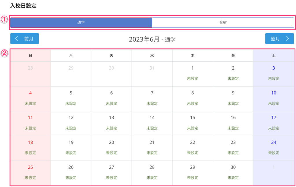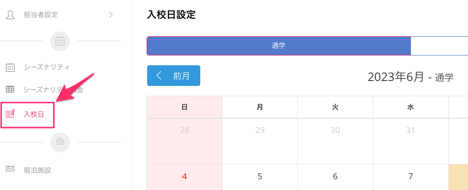 カレンダーから入校可能な受付日の設定を行うためのメニューです。
