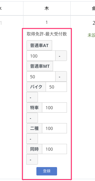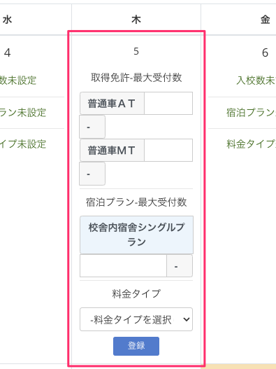 合宿の場合は取得免許の最大受付数と、宿泊プランの最大受付数と、料金タイプをそれぞれ設定します。