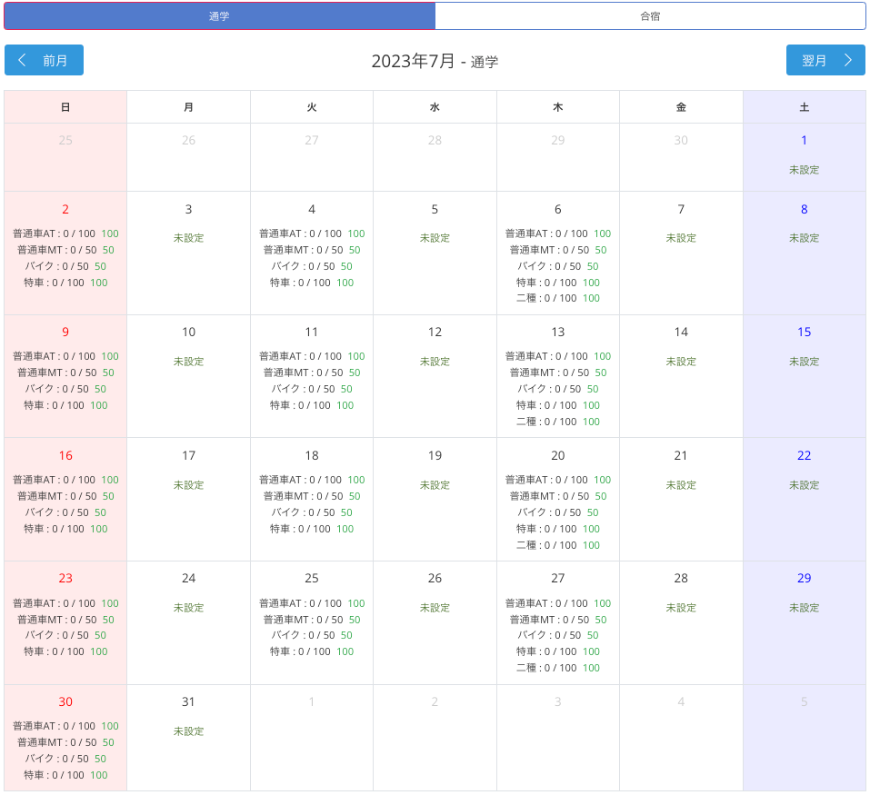 「通学」と「合宿」でそれぞれ受付可能日を作成することができます。