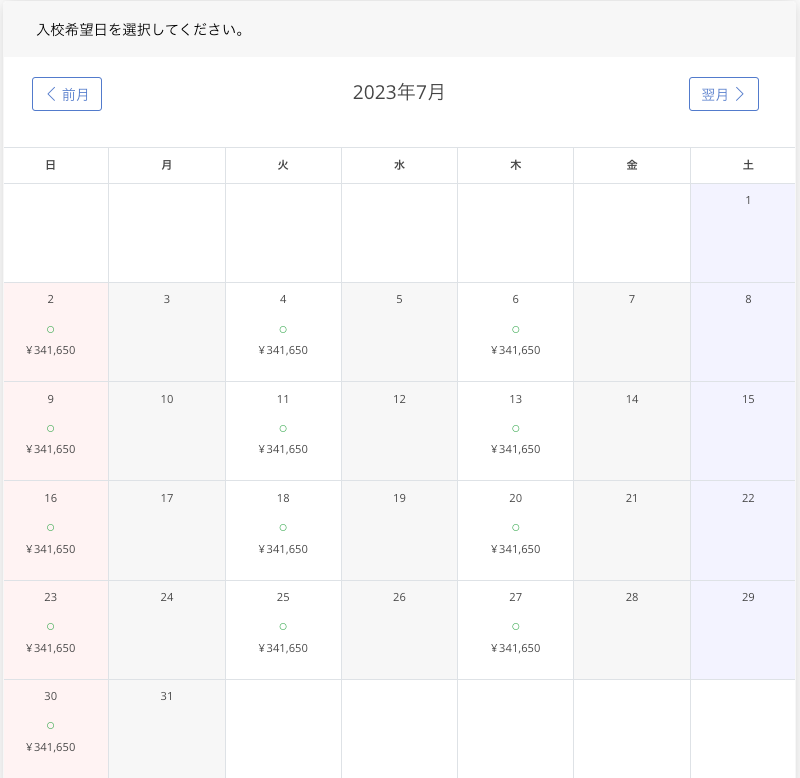 ここで設定した受付可能日が申し込みページの「入校日の選択」に反映します。