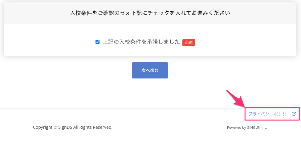 設定すると申し込みページのフッター右側に「プライバシーポリシー」のリンクが設置されます。