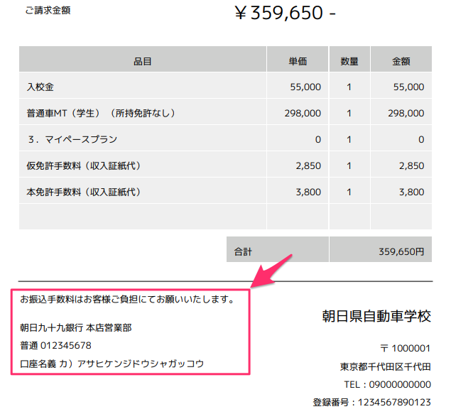請求書に記載する支払いに関する情報を7行以内のテキストで入力します。