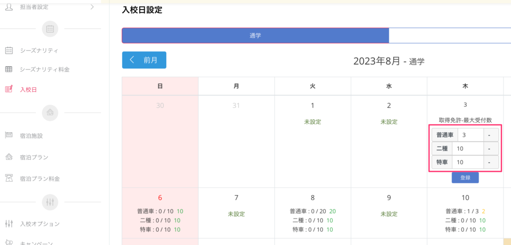 「入校日設定」では在庫グループごとに受付可能な申し込み枠を設定します。