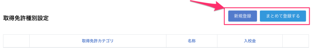 「取得免許種別設定」画面が表示されますので、[新規登録]または[まとめて登録する]をクリックします。