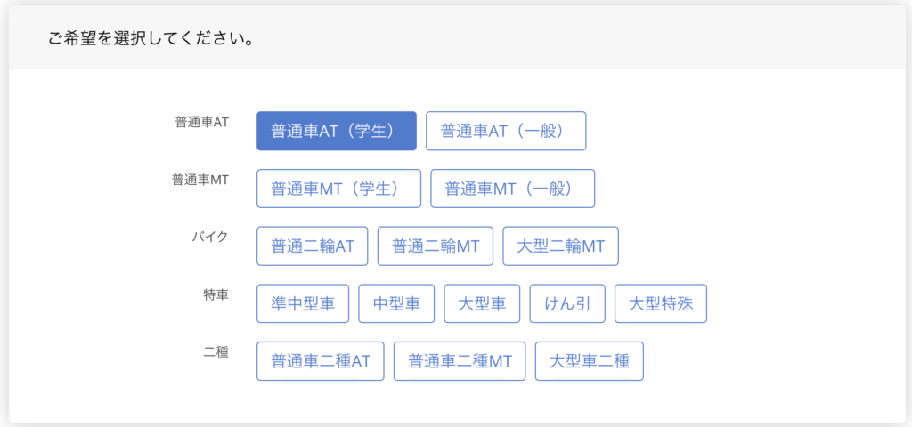 申し込みページの「希望車種選択」画面に表示される選択肢となります。