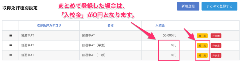 まとめて登録した場合は「入校金」は0円で設定されますので、金額を指定する場合は個別に[編集]から修正を行ってください。