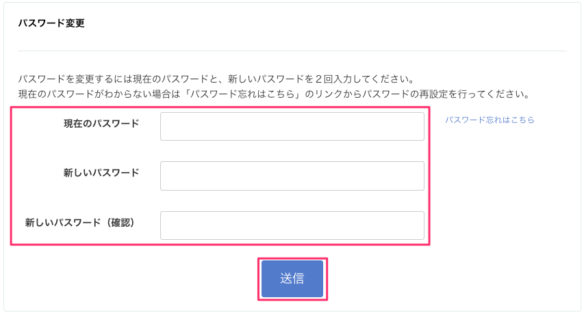ログインする際のパスワードを変更したい場合は、「現在のパスワード」と「新しいパスワード/新しいパスワード(確認)」を入力して、[送信]をクリックします。