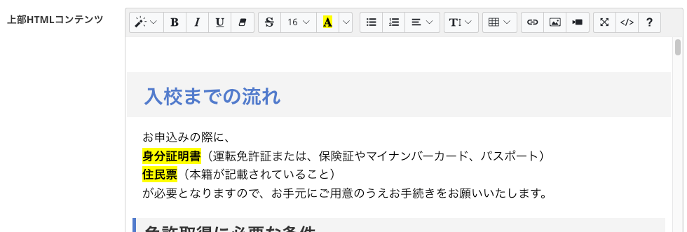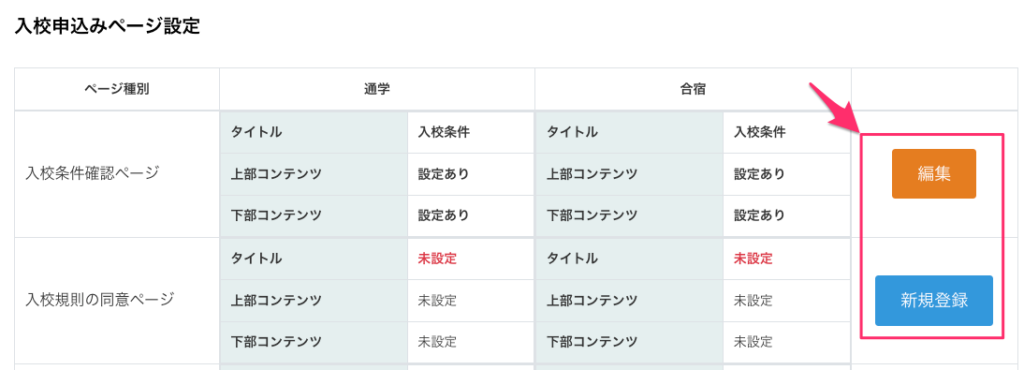 2.「入校申込みページ設定」から編集したいページの[新規登録]または[編集]をクリックします。