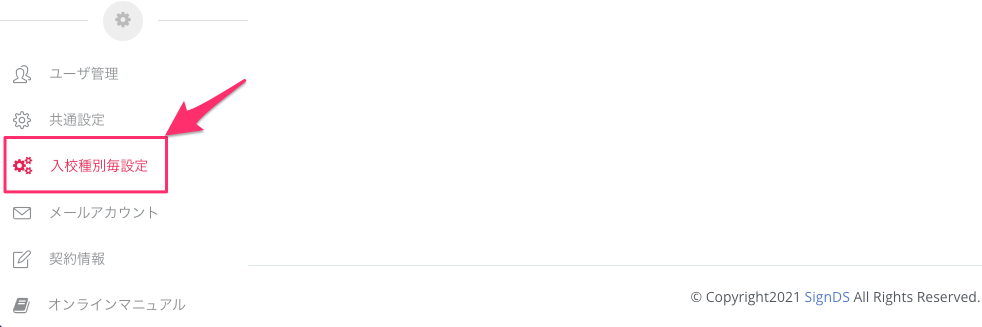 画面左のメニューから「入校種別毎設定」をクリックします。