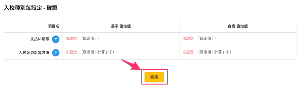 画面右に「入校種別毎設定 – 確認」が表示されますので、[編集]をクリックします。