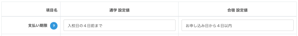 入校種別(通学/合宿)ごとの共通設定を行うためのメニューです。
